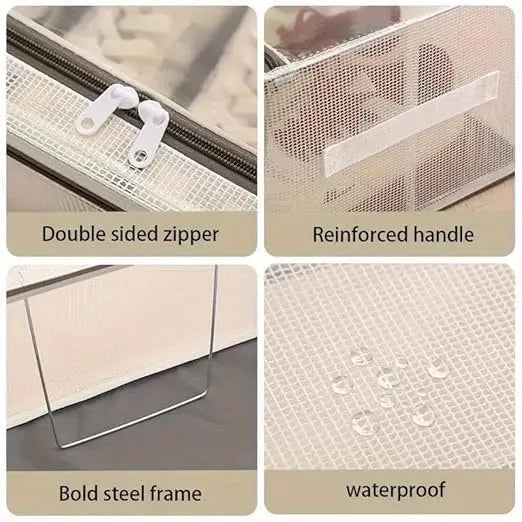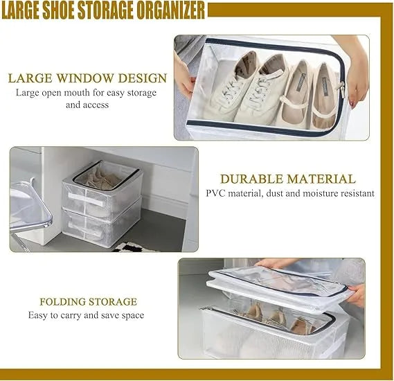 Our Shoe Organizer is made from high-quality PVC and a thickened stainless steel frame, making it sturdy, durable, and resistant to deformation. Multifunctional Transparent Shoe box Large capacity Stackable It can hold up to 20 kg and be stacked safely without crushing shoes. The foldable design saves space, while the stitched handle ensures easy handling. Waterproof and dustproof, it keeps shoes clean and dry. Ideal for closets, entryways, and under beds, its clear, transparent boxes let you easily view and access shoes, offering a neat, stackable, and space-saving storage solution.