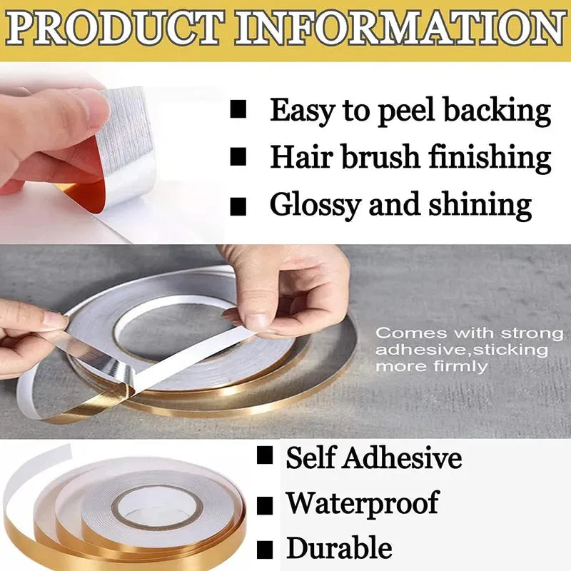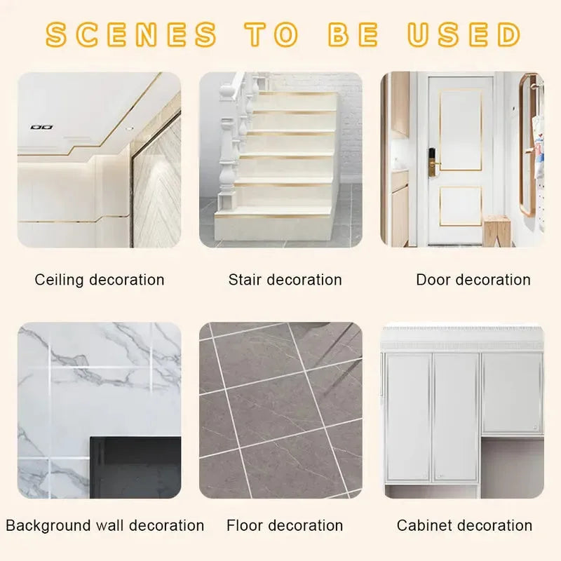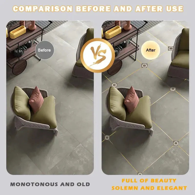 This decorative trim tape is perfect for floors, door seams, tiles, and other gaps, adding a stylish touch to your home. It allows for creative DIY decoration, enhancing the look and elegance of any space. Tile stickers for flooring Tile stickers for flooring Ideal for walls, floors, glass, skirting lines, and waistlines, it features strong adhesive backing for easy installation on smooth, dust-free surfaces. The brushed texture gives it a shiny, refined finish, while the waterproof coating protects against moisture and dirt. Mix and match different designs to create a unique, colorful atmosphere and completely refresh your home décor.